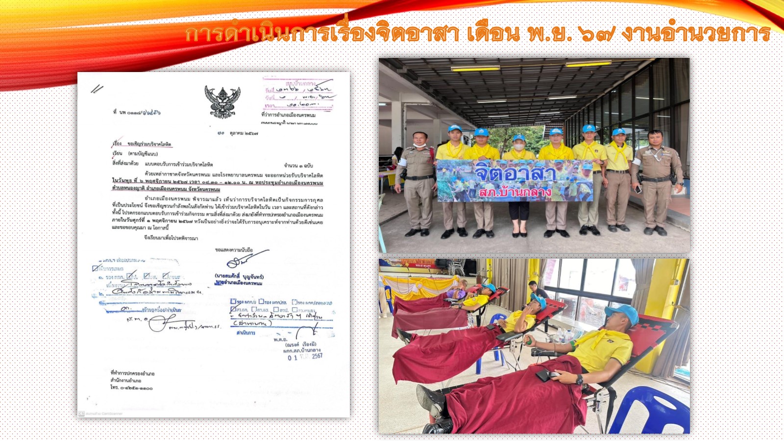งานอำนวยการ ร่วมกิจกรรมจิตอาสาบริจาโลหิต ( 6 พฤศจิกายน 2567 ) ข้าราชการตำรวจจิตอาสาและงานอำนวยการ ส